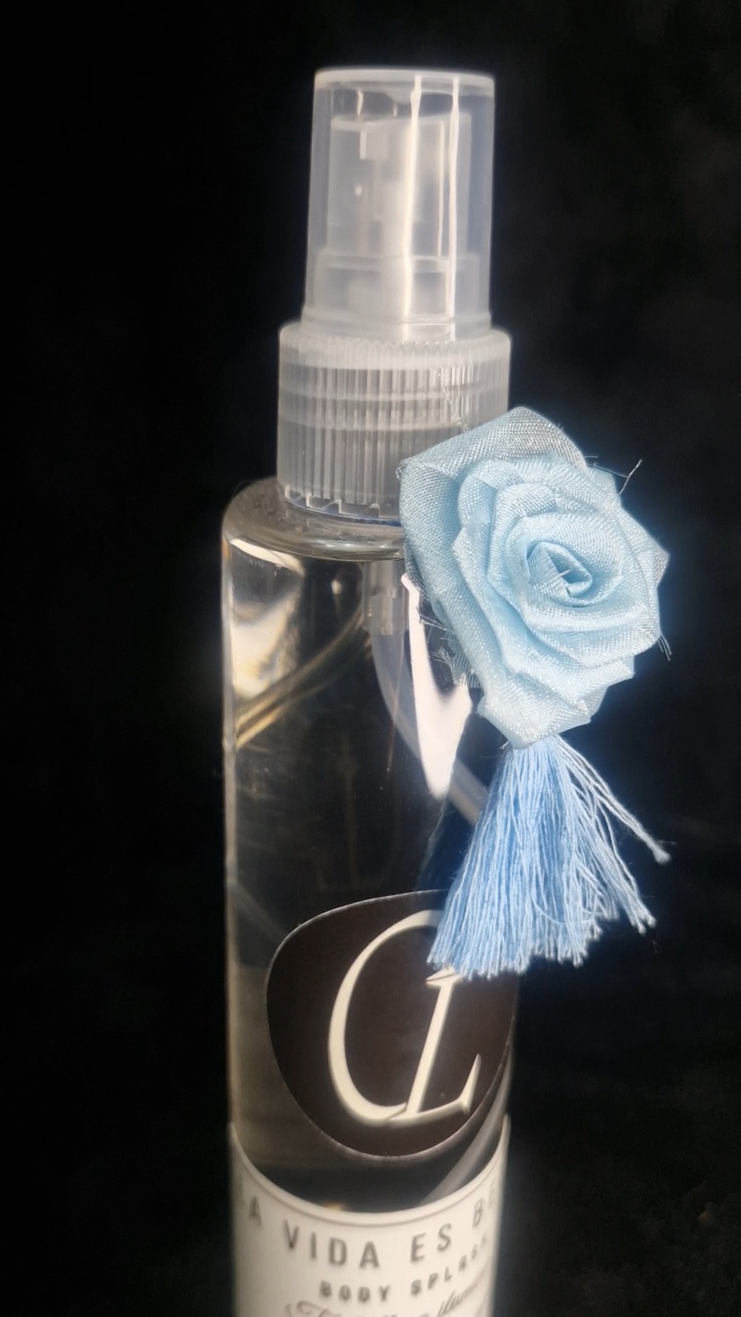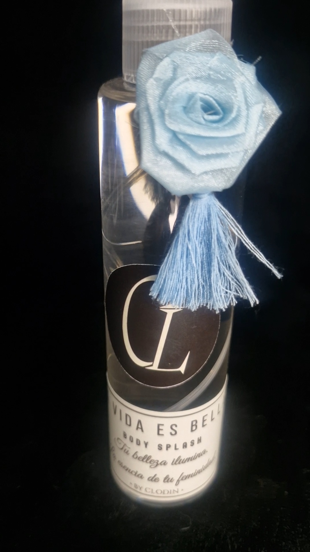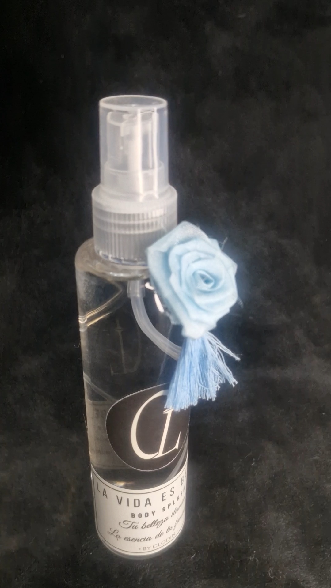 Su envase PET transparente de 150 ML, con una flor artesanal de tela y el logo caracteristico de la marca. Une elegancia y frescura en una sola esencia.